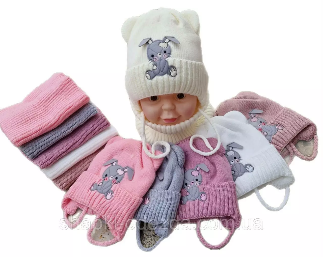91020 Комплект зимовий Фліс для дівчинки шапка із зав'язками та баф Зайчик"різні кольори (6 місяців до 3 років