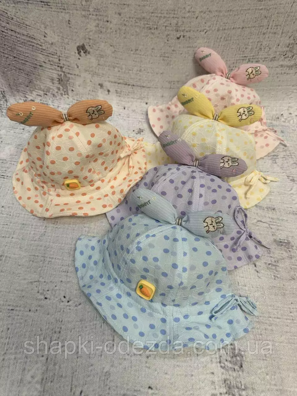 Декорирована бантиком с рисунком зайки и резиновой нашивкой морковки