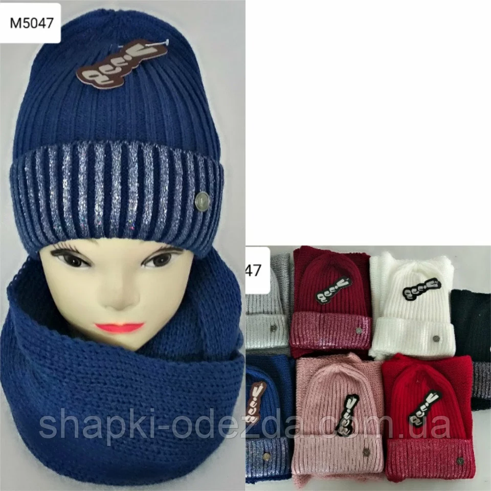 Детская вязаная шапка + баф для девочки на флисе на 3-12 лет ( Кашемир) зима