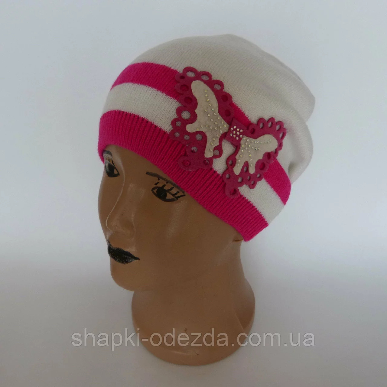Детская вязаная шапка для девочки с бабочкой от 4-6 лет