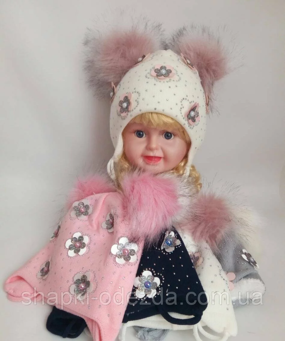 Детская вязаная шапка с мехом для девочки х/б подкладка р 50