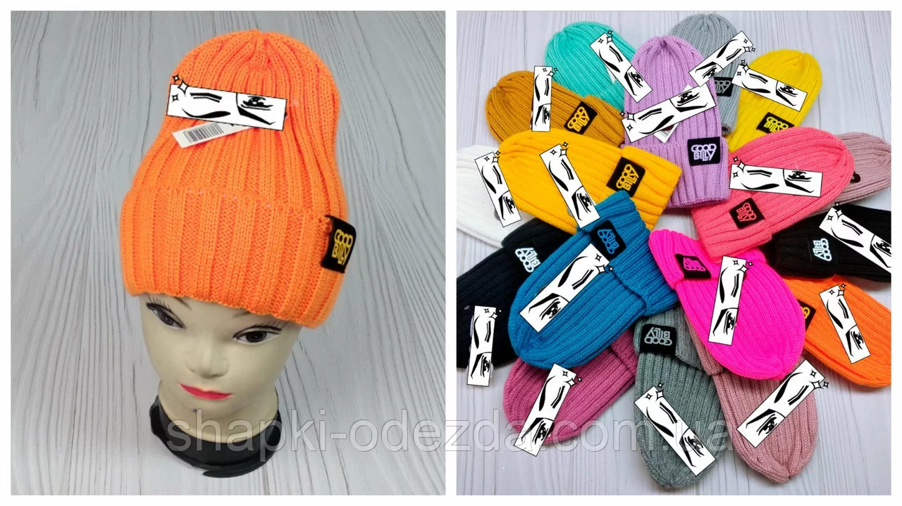 91047. Шапка подвійна з відворотом жіноча-підліткова "ГЕРБ", різні кольори, 5-60 років