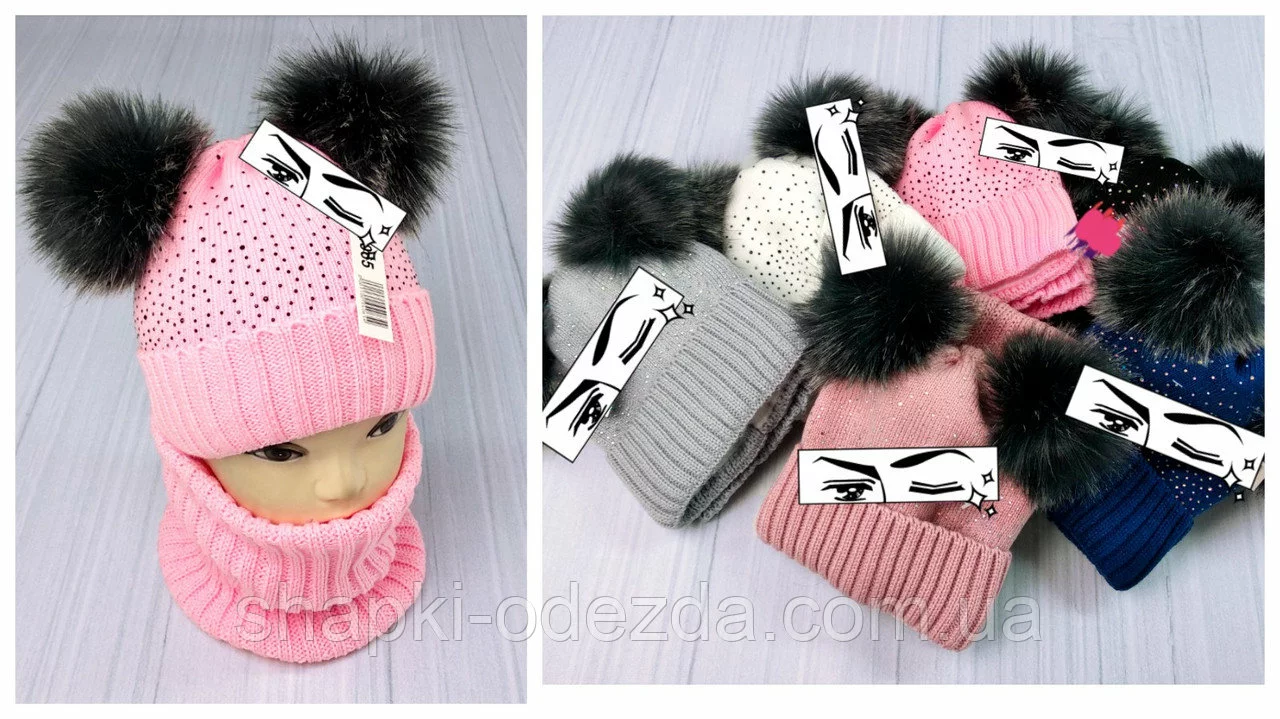 М 94065 Комплект для девочки шапка с двумя помпонами,стразами и снуд , разные цвета ФЛИС