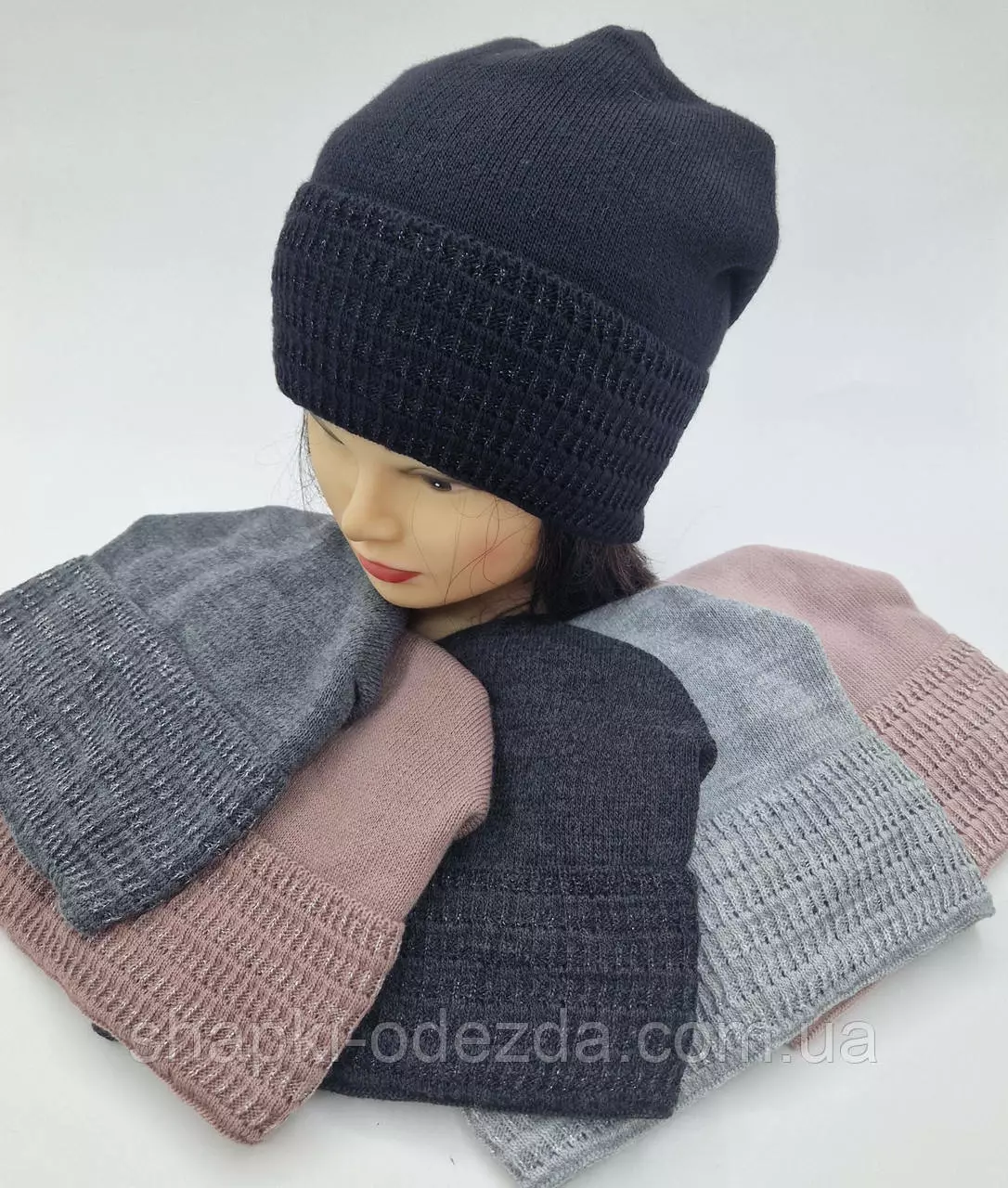 Молодежная вязаная шапка для девочки на флисе с метализированой нитке