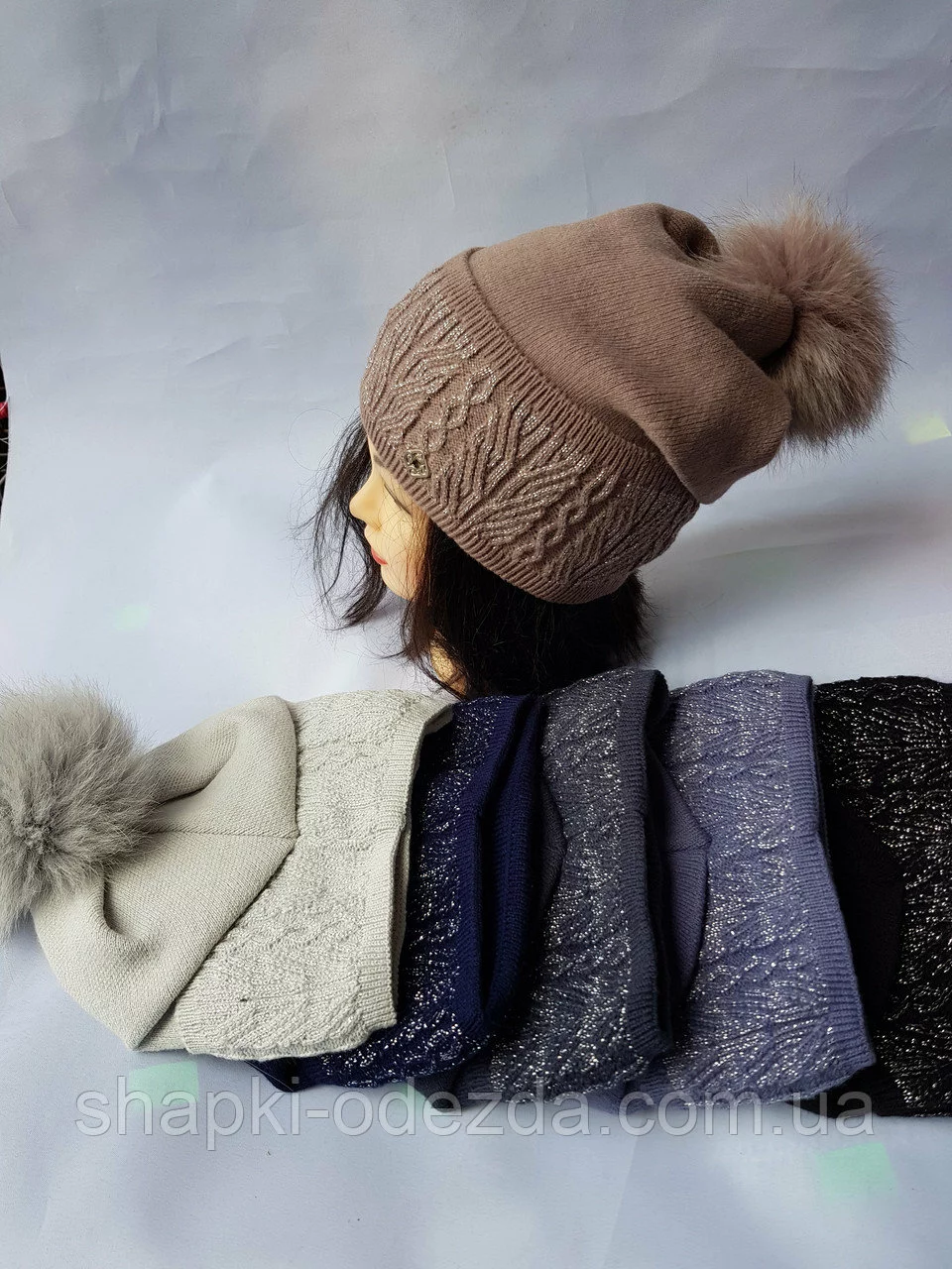 Молодежная вязаная шапка на флисе для девочки с песцовым помпоном