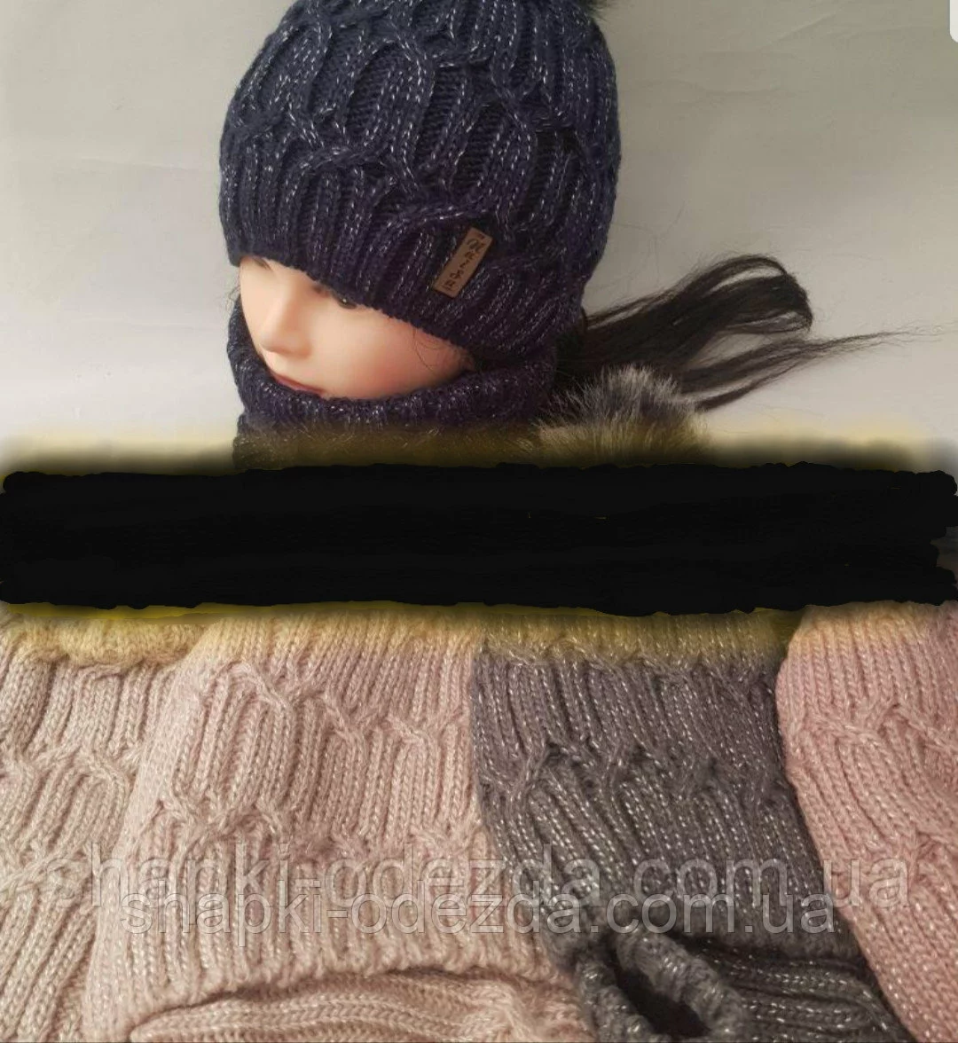 Шапка вязаная + баф для девочки на флисе (Ксюша)