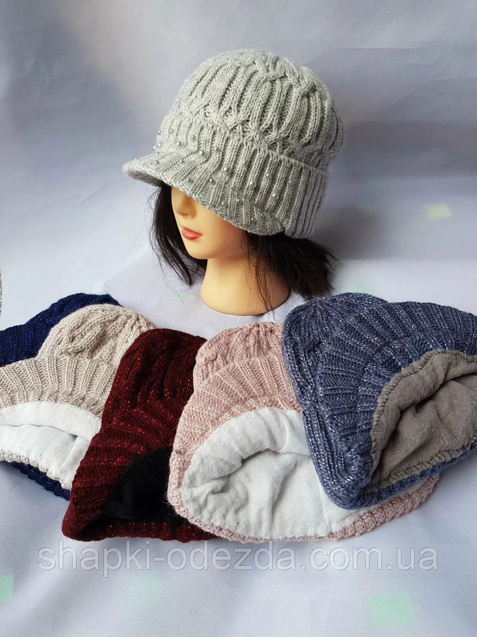 Шапка вязаная для девочки на флисе с Козырьком ( Римма )