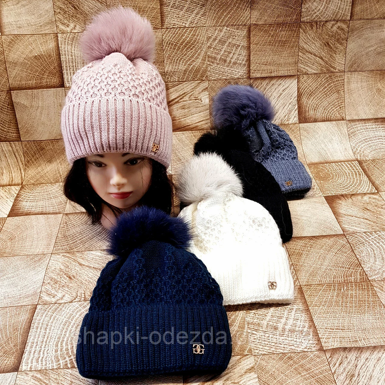 Шапка вязаная для девочки подросток, женская на флисе с Натуральным помпоном