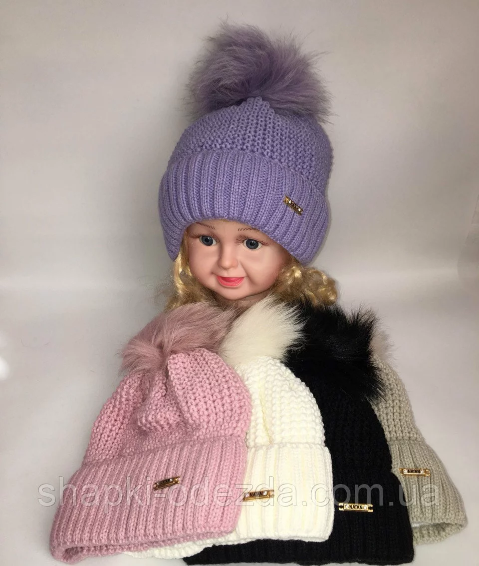 Шапка вязаная на флисе для девочки с натуральным мехом р 50-52 зима