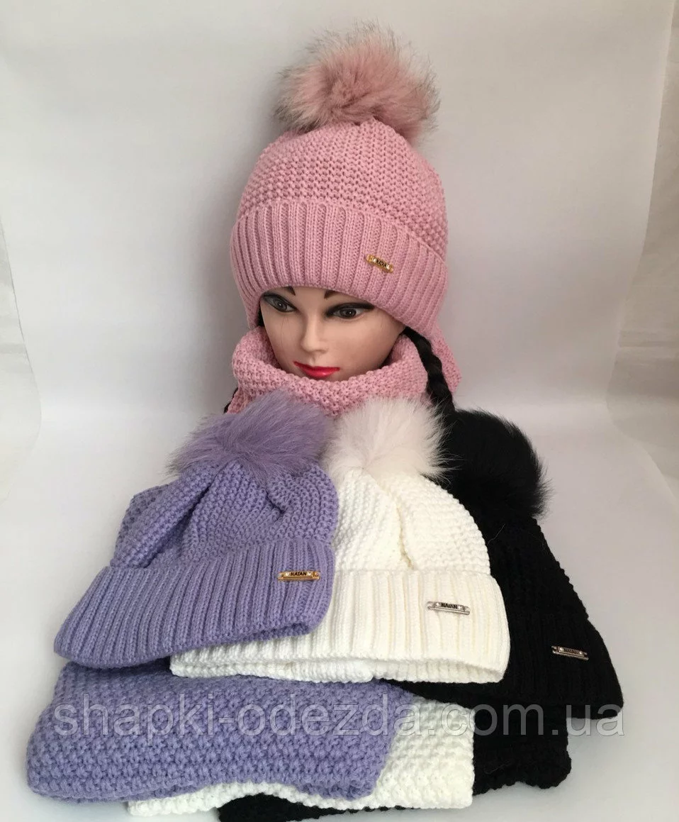 Шапка вязаная на флисе + хомут для девочки с натуральным мехом р 52-54 зима
