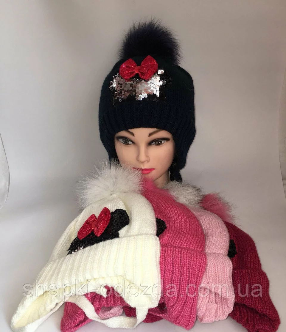 Шапка вязаная на флисе с натуральным мехом для девочки р 48-52 зима