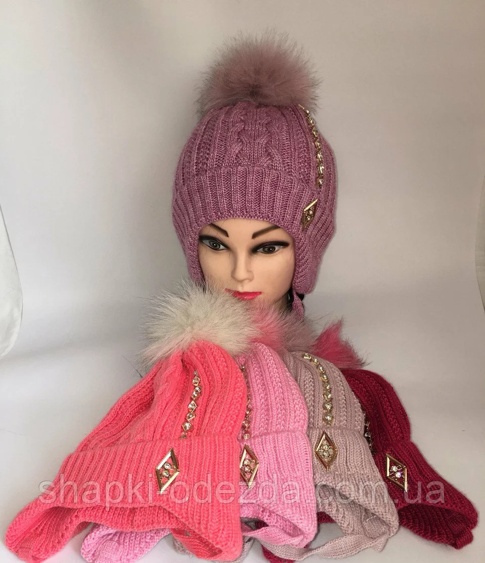 Шапка вязаная на флисе с натуральным мехом для девочки р 52-54 зима