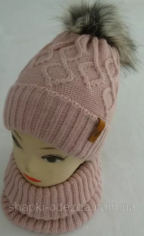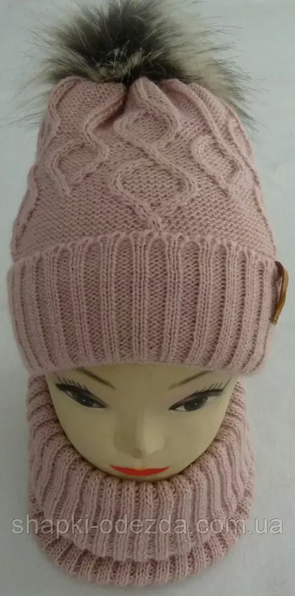 Шапка вязаная с бубоном + баф для девочки зима на пллном флисе Цвета ограничены