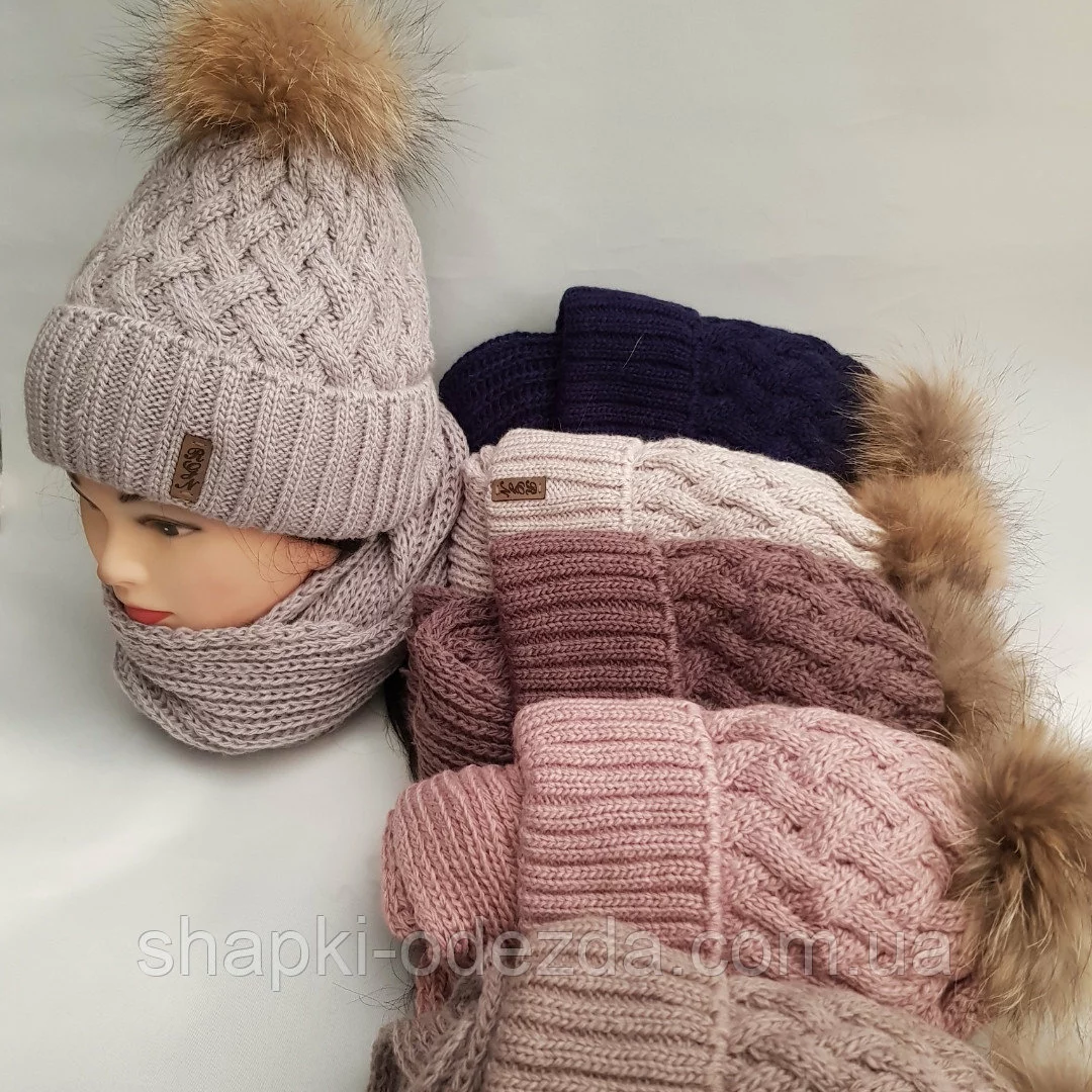 Шапка вязаная с бубоном енота на полном флисе с подворотом + хомут для девочки