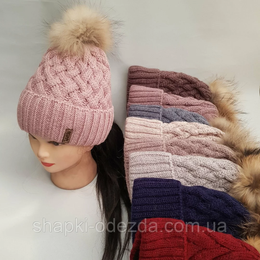 Шапка вязаная с подворотом и бубоном енота для девочки на полном флисе зима