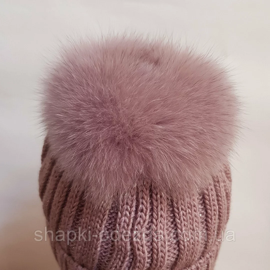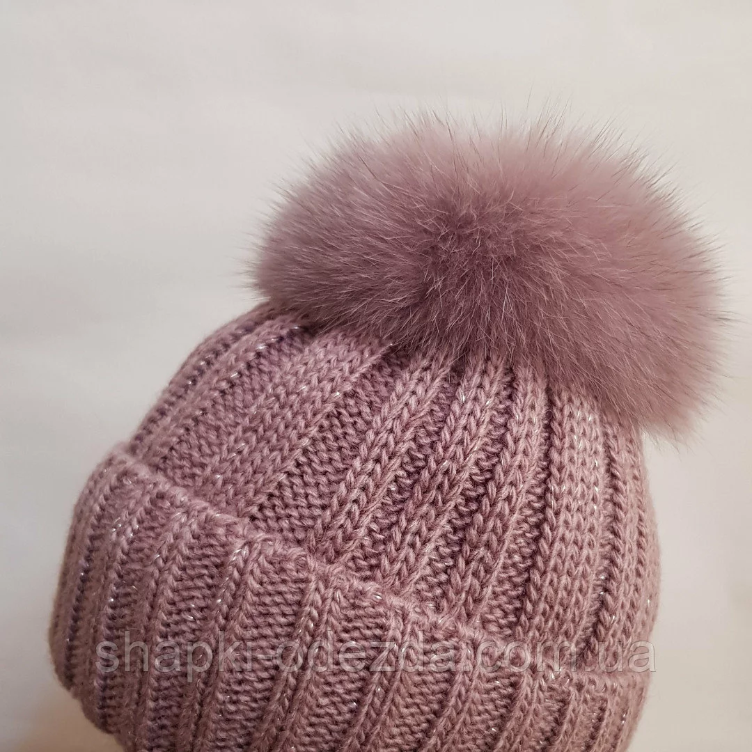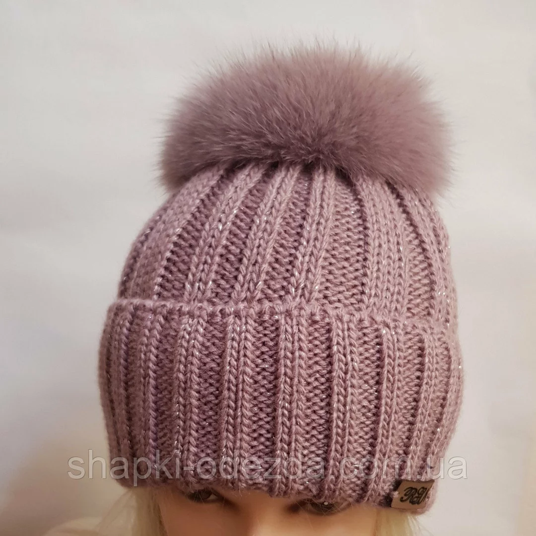 Шапка женская на флисе с люриксовой ниткой и большим помпоном из натурального песца