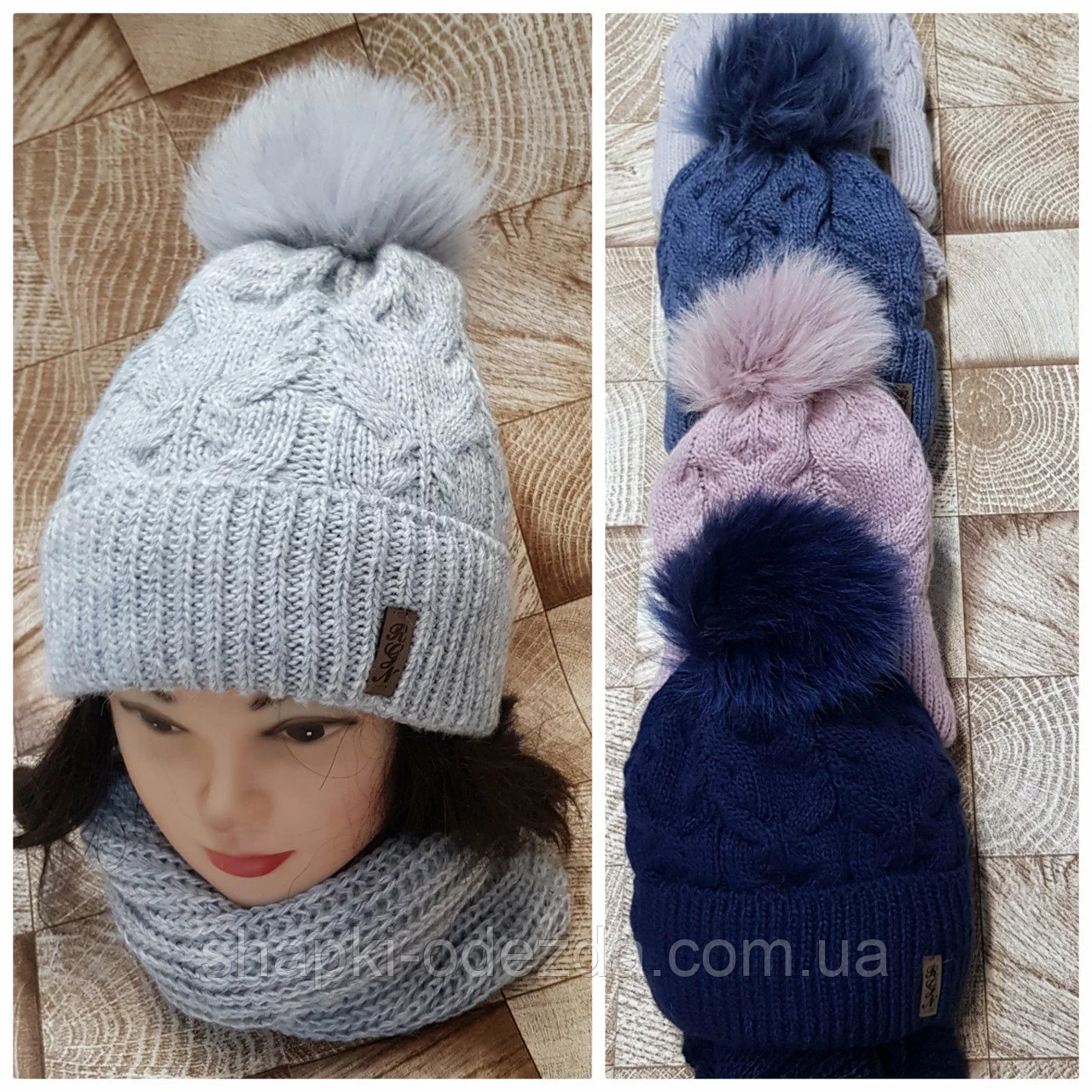 Шапка зимняя с Песцовым помпоном и хомутом на полном флисе