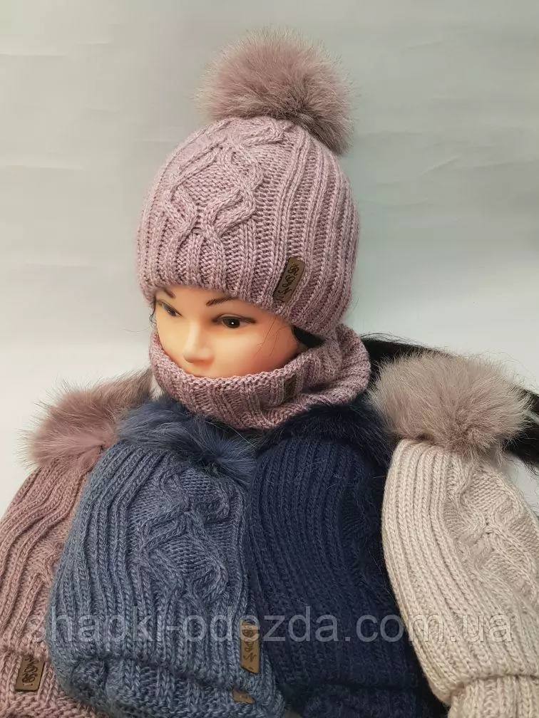 Шапка зимняя женская на флисе +баф на флисе натуральный бубон (361)