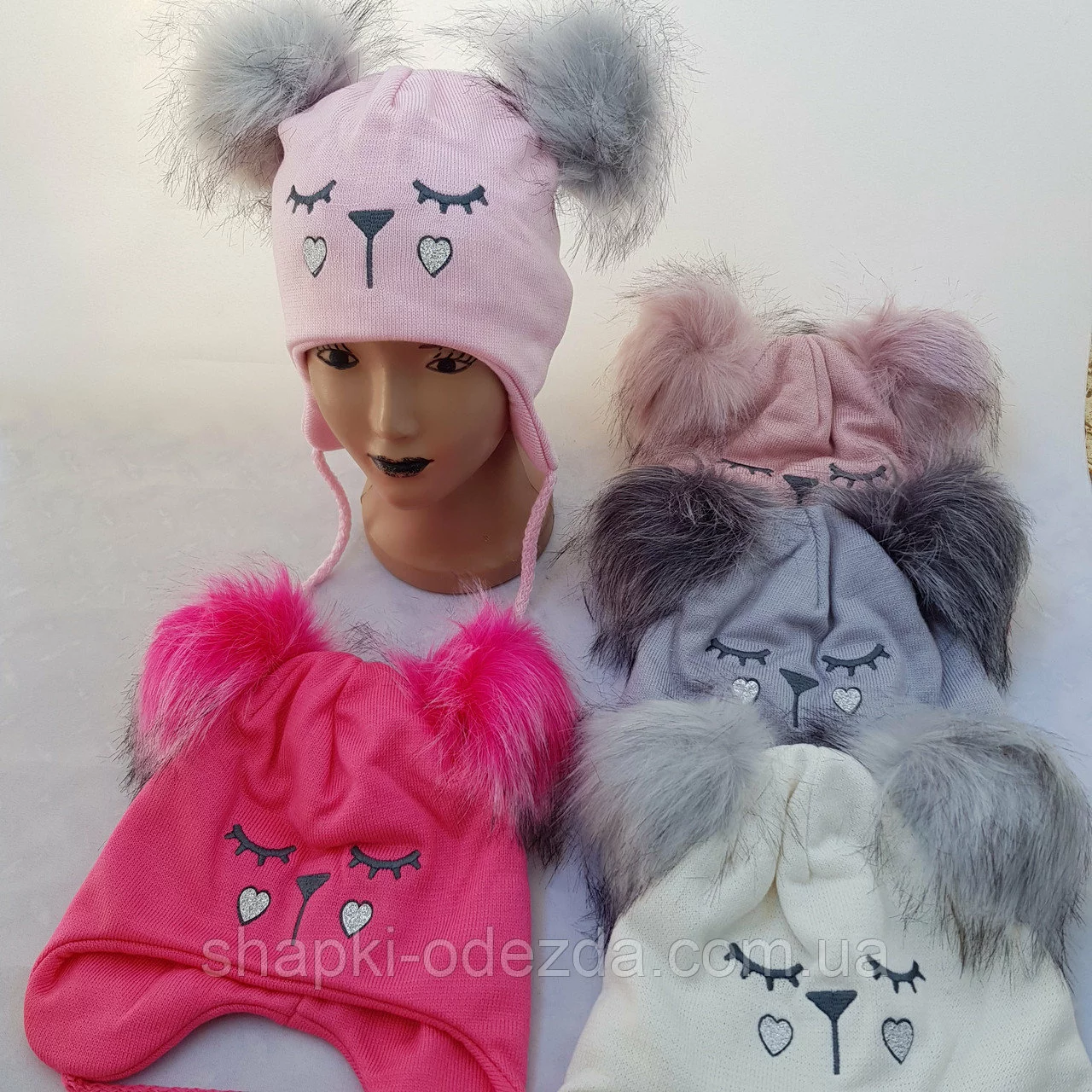Шапки вязаная на флисе для девочки с двумя помпонами на завязке р 46-48 (563)
